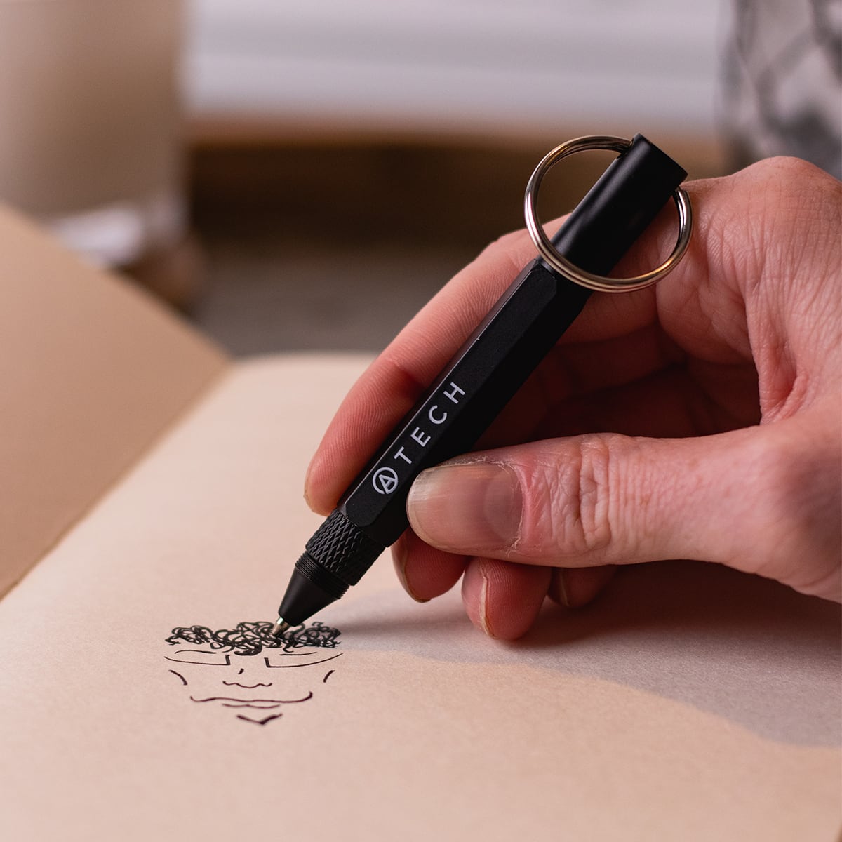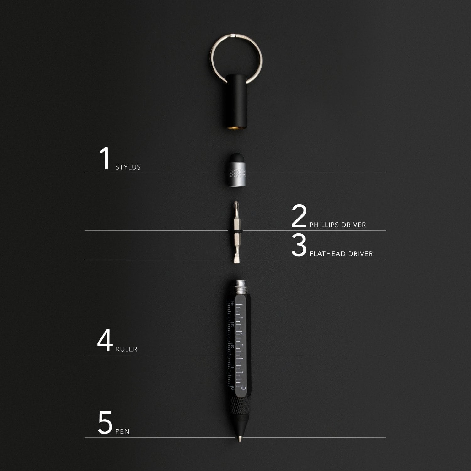 ボールペン、タッチペン、プラスドライバー、マイナスドライバー、定規を備えたコンパクトなマルチツールペン。ペンの上部にはキーホルダーがついているので、鍵やバッグなど手持ちのアイテムにかけて一緒に持ち歩くことができます。タッチペンはATM画面や店舗のタブレット端末などを非接触で操作したいときにも役立ちます。
